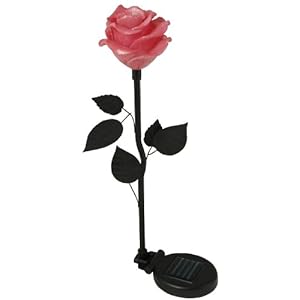 Use this solar powered rose for a fun way to add color to your garden during the day and accent light at night. It sits 27-1/1-inches tall and stands up straight. The Frame is made of metal and has a dual stake to ensure stability in the ground. The flower is polyresin and feels very durable. It underneath the rose is an LED sure to outlast and glow beautifully. Even in areas cloud coverage, this light will glow beautifully. It comes with a pre-charged battery so all you have to do is take it out of the box and flip the switch to "OFF/Auto" switch to "Auto". This will make it so the Light turns on in the dark, and turns off in the light and charges itself. Red LED and AA NiCd battery (included).