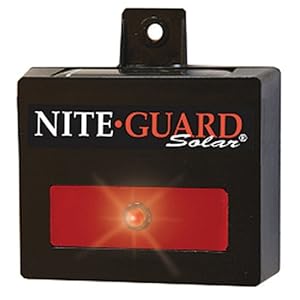 Solar Powered Nite Guard Solar uses sunlight or daylight to charge. No batteries are ever needed. It will continue to activate during long periods of cloudiness. The powerful flash of red light produced from this LED system will automatically activate at dusk and will force all night animals to flee the area. Based on scientific research, Nite Guard Solar emits a flash of light implying to all animals that hunt or feed at night that they have been "discovered" or are being watched. This is their deepest fear and forces them to flee the area. A simple, but effective concept. Automatically turns on at dusk and off at full daylight. This weatherproof unit will last approximately 3-4 years. Use the Nite Guard Solar to protect poultry and livestock against coyote, fox, bear, mountain lion, wolf, bobcat, owls, hawks, mink, weasel, and skunks, gardens (flowers, vegetable), orchards, vineyards against deer and raccoon, bird feeders, purple martin houses, fish ponds against raccoon, hawks, owls, blue heron, and bear, campsites, cabins, and property against bear, raccoon, mountain lion and even human intruders. 60-day money back guarantee, 1-year limited warranty. Mount the lights at eye level of the animal to be stopped and face it away from the area to be protected. One to four lights will be required depending upon your application. It not motion activated but will flash automatically from dusk through dawn so night animals are stopped at long distances (500 yards or more) away. They do not come in to investigate but see the flash as a threat the instant they are aware of it. Maintenance Free: Nite Guard Solar is completely weatherproof and will continue to function or years under extreme weather conditions. Blistering heat, below zero temperatures, rain, ice, snow and blowing dust/grime will not compromise the nightly function of this product.