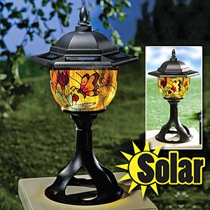 No outlet or wires required!Runs for around 8 hours on full charge.2 super bright white LED's automatically turn on at dusk.Runs on 1 Ni-MH rechargeable battery - included.4 solar panels recharge the battery by day. Princess International Tiffany Style Solar Patio ; Garden Light - PI-5089.
